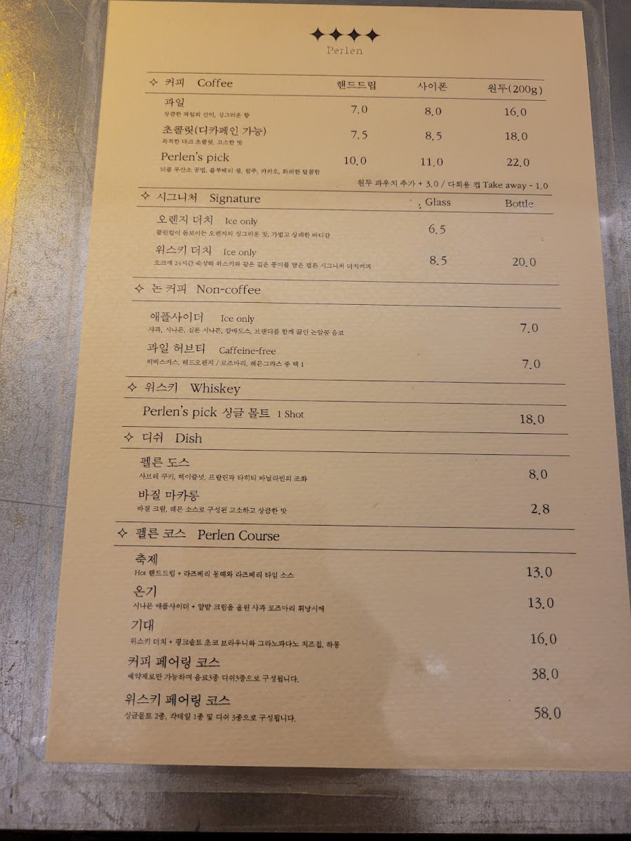 The café doesn’t stop at extraordinary pairings; it also boasts an impressive selection of non-alcoholic beers, including the Super Stout, with subtle oak aromas and a smoky finish, or the Coffee Golden Ale, both priced at ₩7,000. Furthermore, the coffee menu offers an enticing Seasonal Single Origin hand-drip or siphon coffee at ₩7,000, as well as their signature Perlen White, a latte with a luxurious creamy texture for just ₩6,500.
