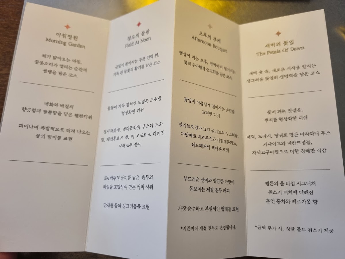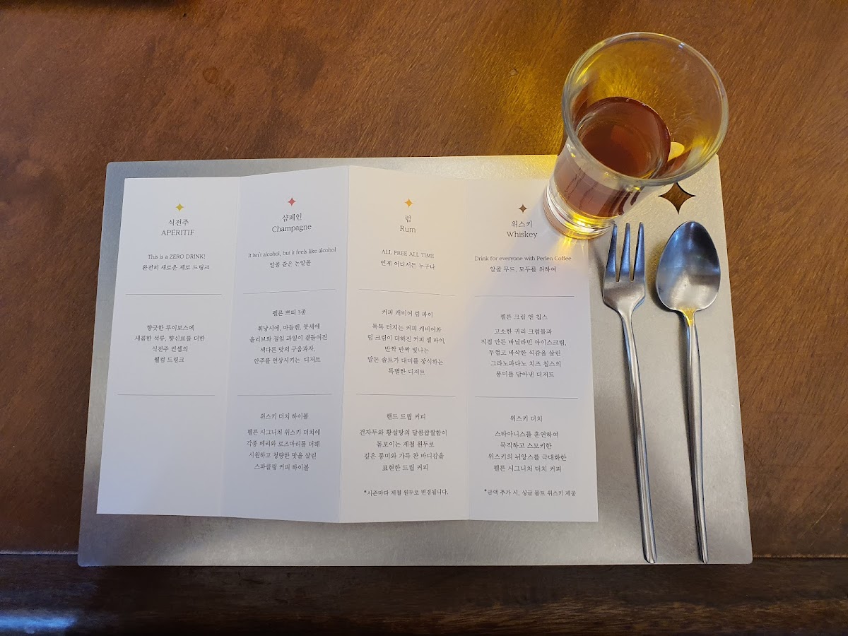At Perlen, the focus is on inventive pairings that enhance both their food and drink offerings. The Pairing Set B is a must-try, featuring crunchy, nutty grissini served alongside a rich, homemade bourbon highball crafted with nonalcoholic bourbon whisky and rooibos tea, all for an incredibly reasonable ₩14,500. For those seeking a dessert that marries texture and flavor, Pairing Set A will charm your palate with its soft potato millefeuille and a nonalcoholic coffee ale, perfectly complemented by smoky oak notes for ₩17,000. The combination of flavors is sublime, as the delicate layers of the millefeuille sing together with every sip of expertly paired beverage.